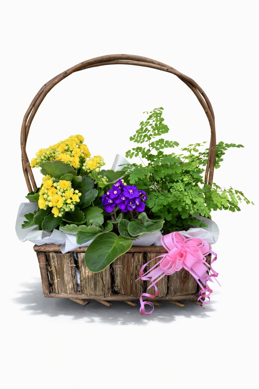 Elevate any space with our signature selection of three seasonal plants, artfully arranged in a textured rustic basket. Designed for longevity and effortless style, this botanical ensemble offers a lasting alternative to traditional bouquets, providing vibrant life and natural texture to the home for weeks on end.
