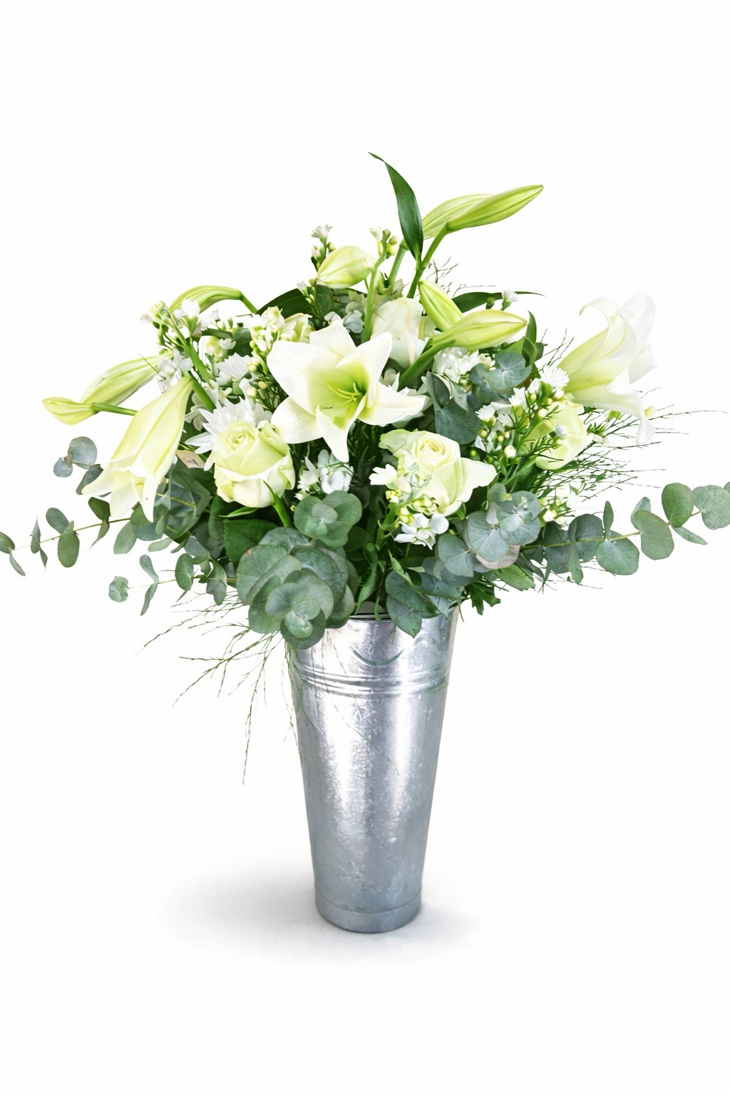 A shimmering silver bucket filled with an abundance of snow-white blossoms. This arrangement captures the essence of grace and light, offering a versatile gift that speaks volumes without a single color.