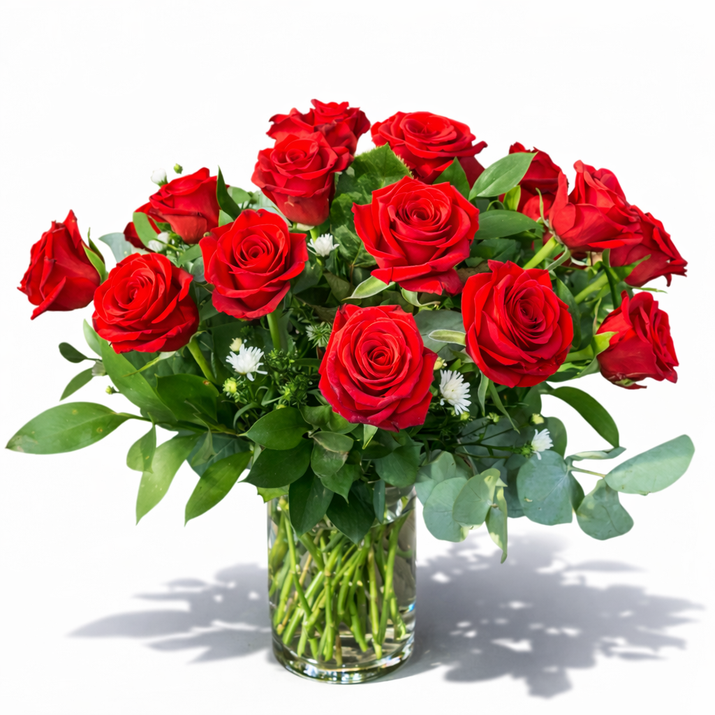 Nothing captures the heart quite like a dozen crimson roses. This traditional arrangement features twelve red roses, expertly gathered and displayed in a sleek glass vase. Framed by delicate greenery to highlight the rich, velvety texture of each petal, this is the definitive gift for anniversaries, proposals, or expressing a love that words cannot quite capture.
