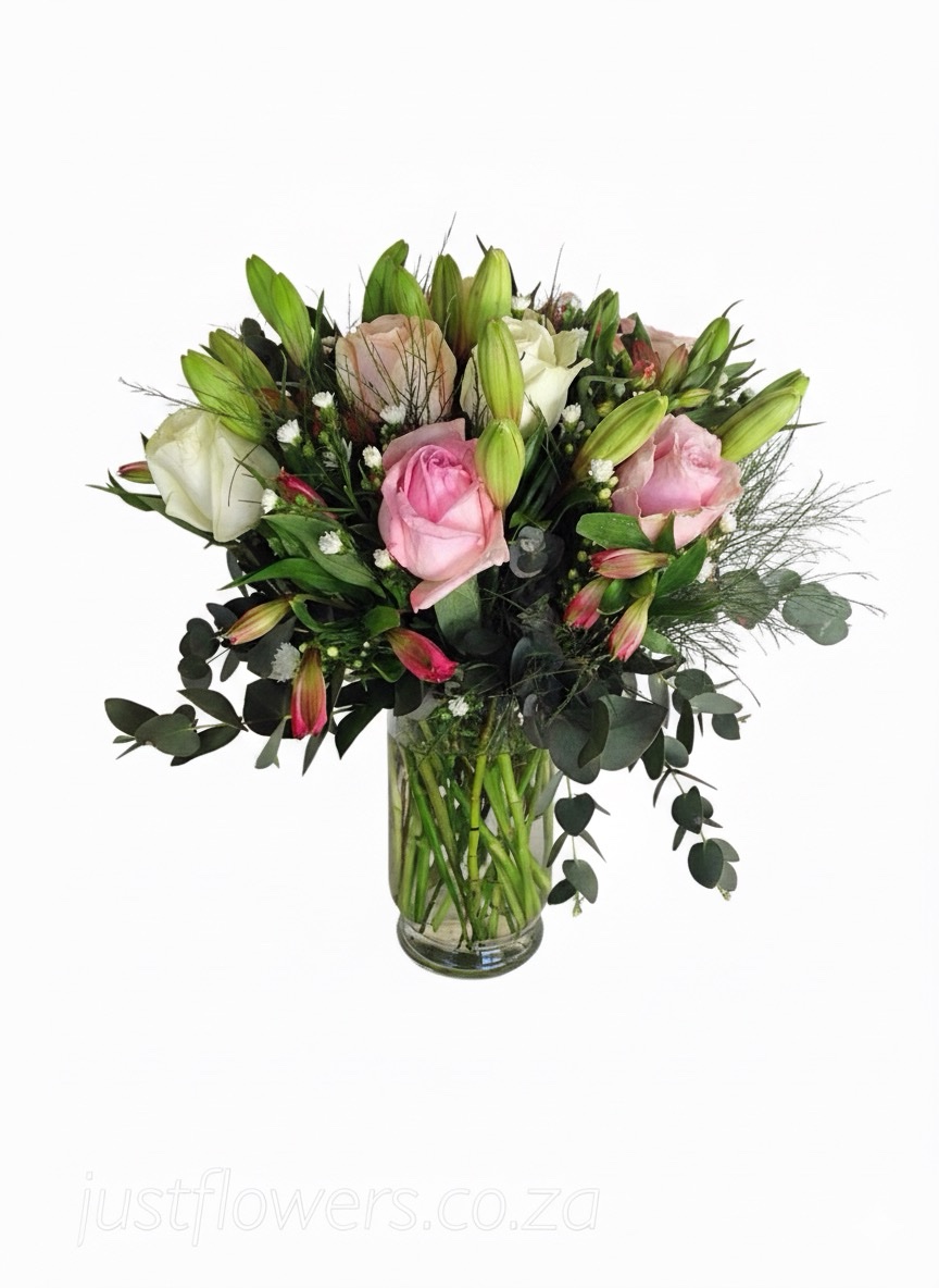 Glass vase filled with Lilly’s and roses. Beautiful arrangement once the Lilly’s starts opening. Orders received before 12h00 Mon- Fri, Sat 11h00 can be done same day, after 12 give us a call to confirm with us.