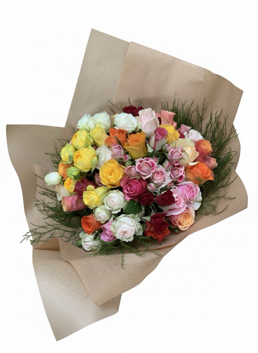 Stunning bouquet of 50 Roses fresh mixed roses wrapped up with greenery and fillers. Orders received before 12h00 Mon- Fri, Sat 11h00 can be done same day, after 12 give us a call to confirm if we can accommodate.