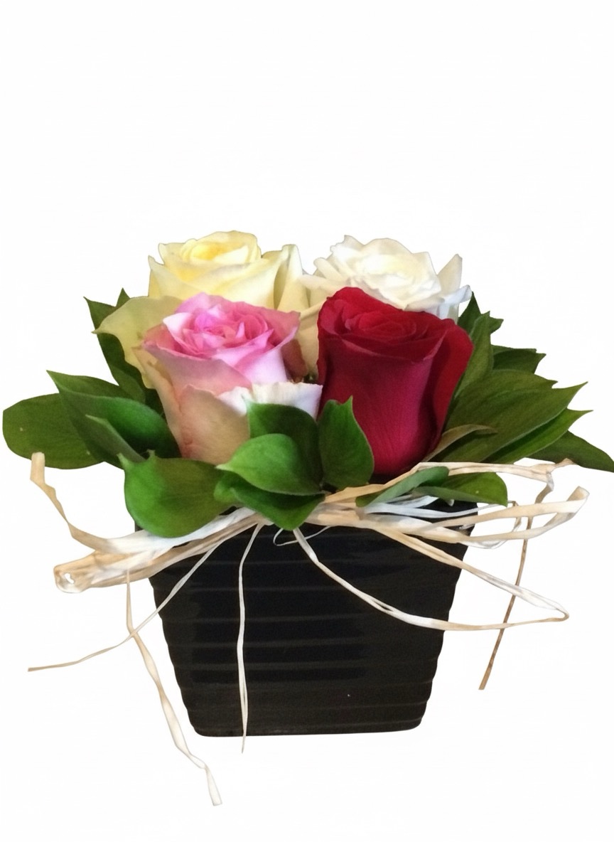 Roses arranged in a Square glass vase. Can brighten any gloomy day! Orders received before 12h00 Mon – Fri and 11h00 on Sat can be delivered same day, if received later please call to see if we can accommodate